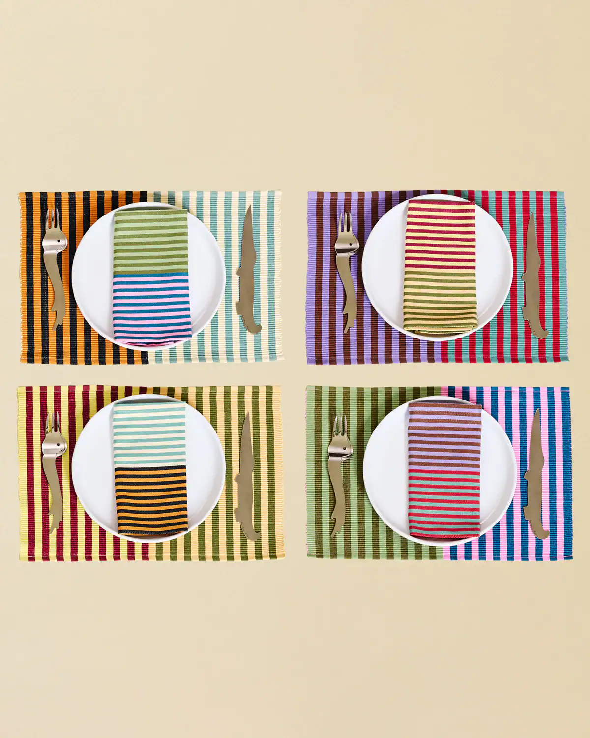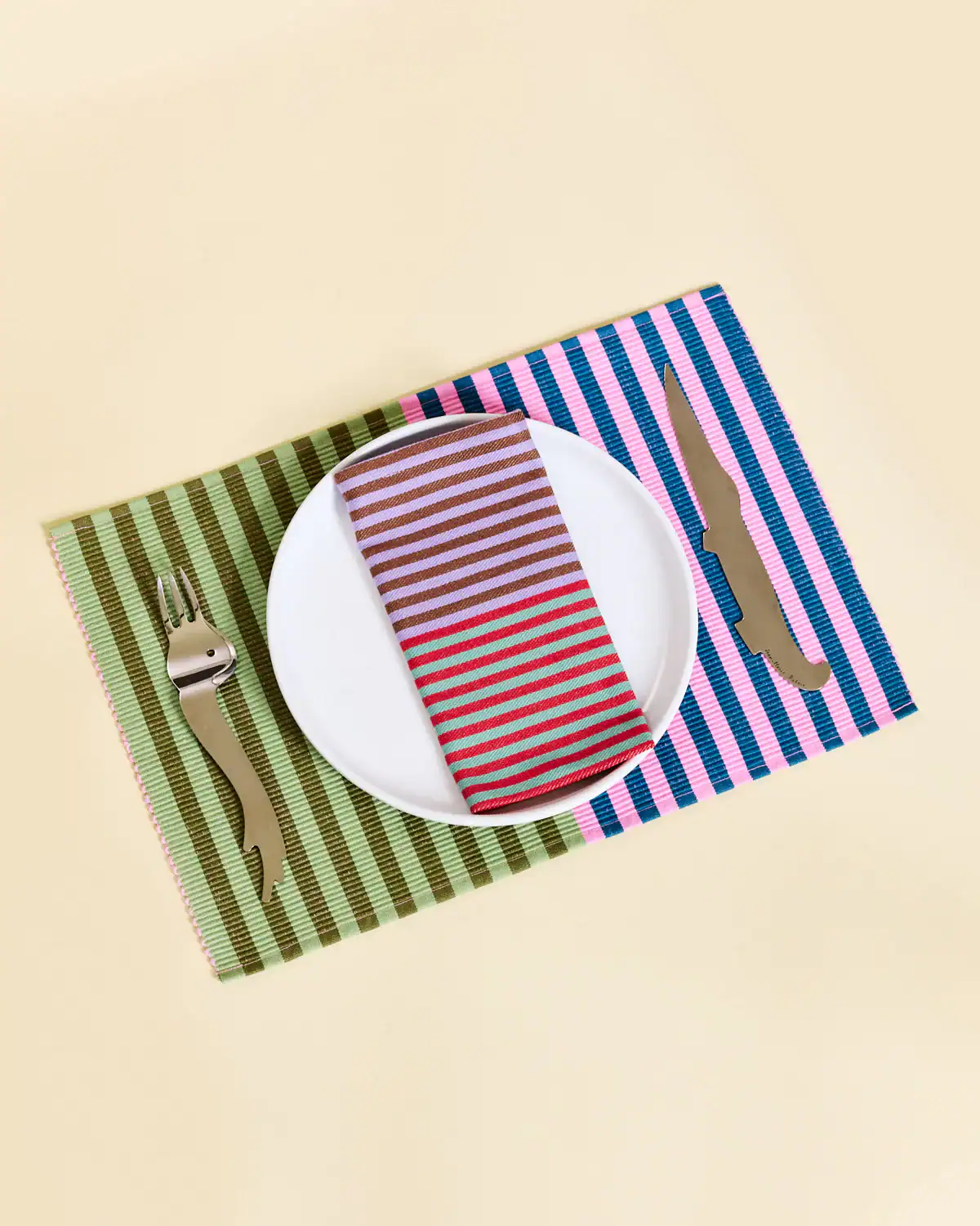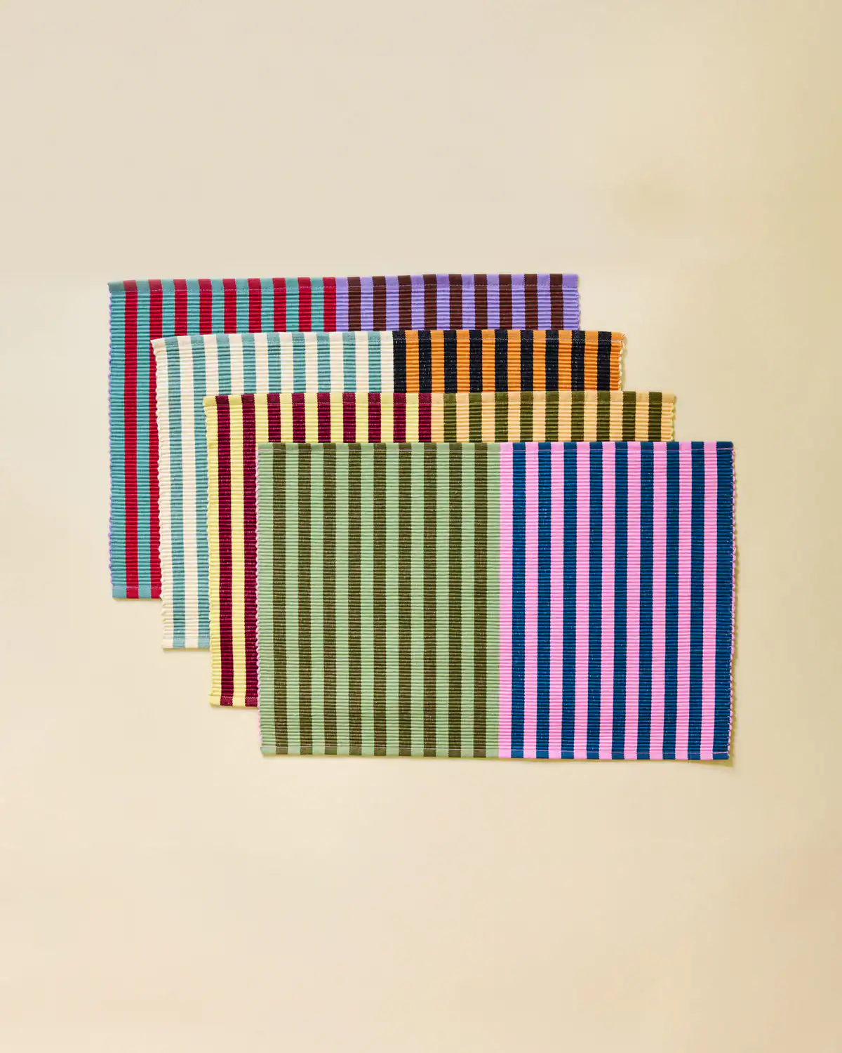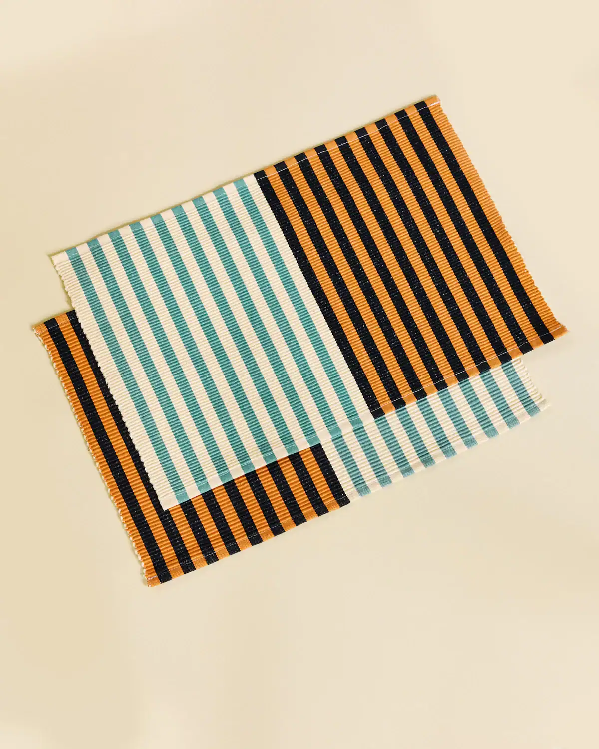 100% cotton. Cotton placemats in tri-color stripes with a ribbed texture. Made in India.