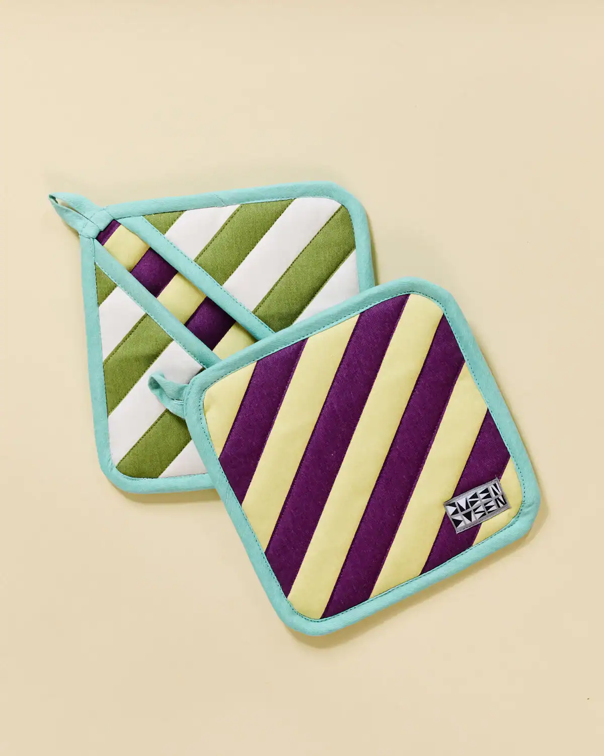 Resists temperatures up to 400 degrees Fahrenheit. Do not use pot holder when wet. Square shape pot holder featuring two interior pockets, top stitched brand label, and a locker loop for easy hanging. 100% cotton quilted canvas base, with 400 GSM polyester fill. Made in India.