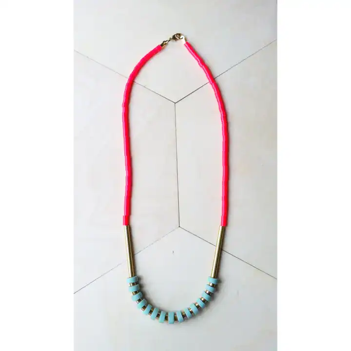 Handmade polymer clay heishi beads with brass spacers on a leather cord with a lobster clasp closure and plastic colourful beads.