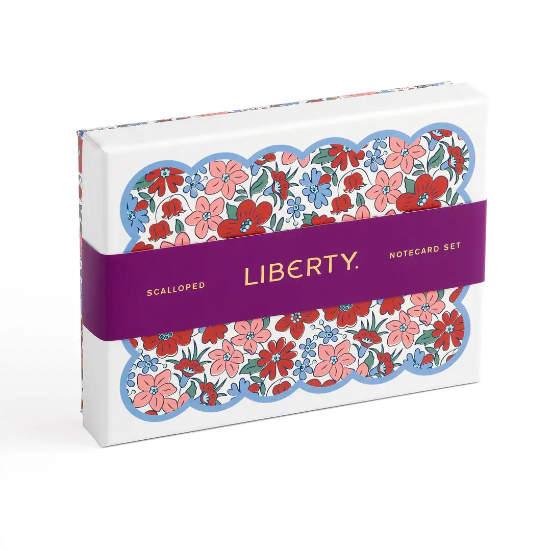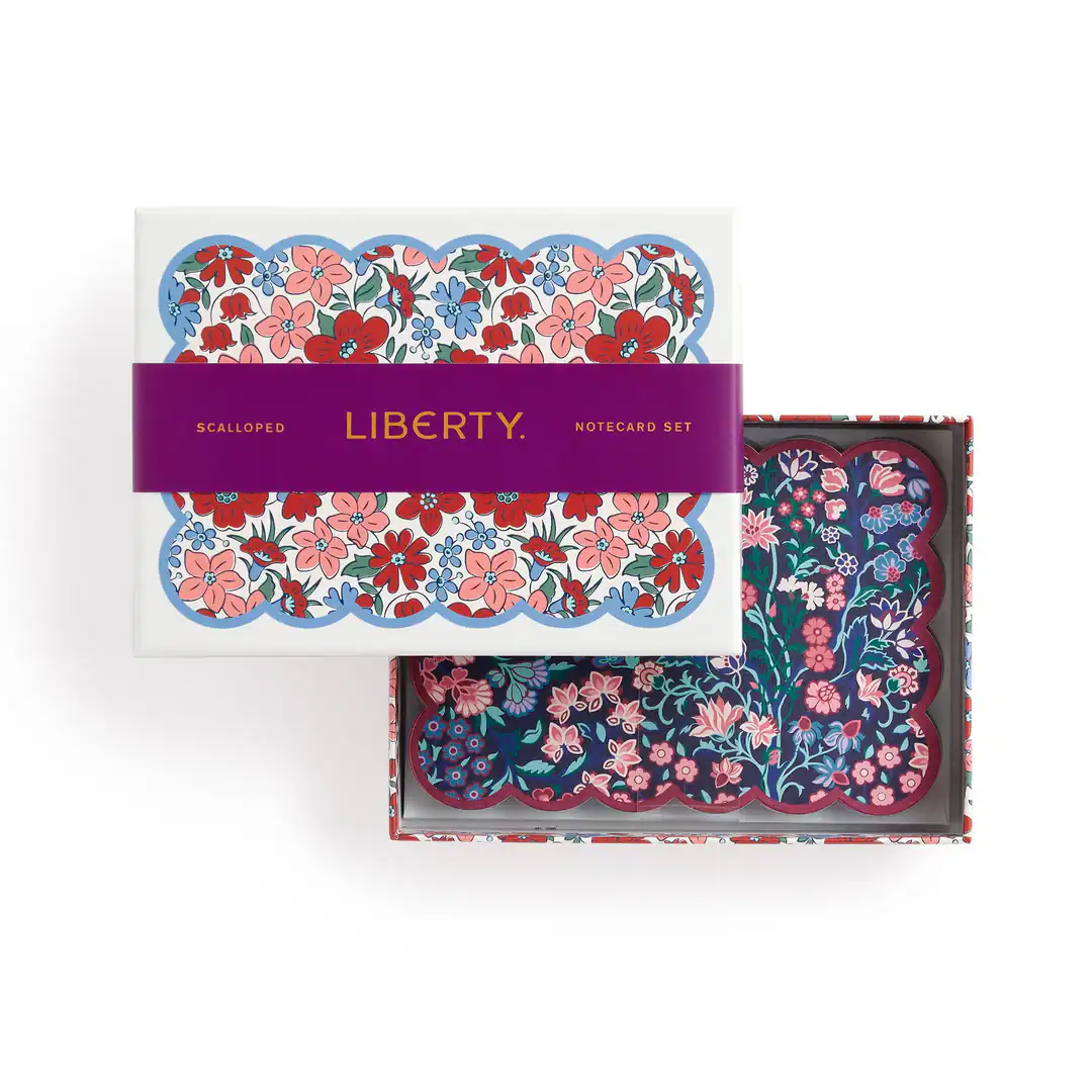 Liberty London is known for its floral and graphic prints and the offering of innovative and eclectic designs. The Liberty Scalloped Shaped Notecard Set includes 8 scalloped shaped notecards, each with a unique floral design from the Liberty Archive, coordinating with a floral-printed envelope.