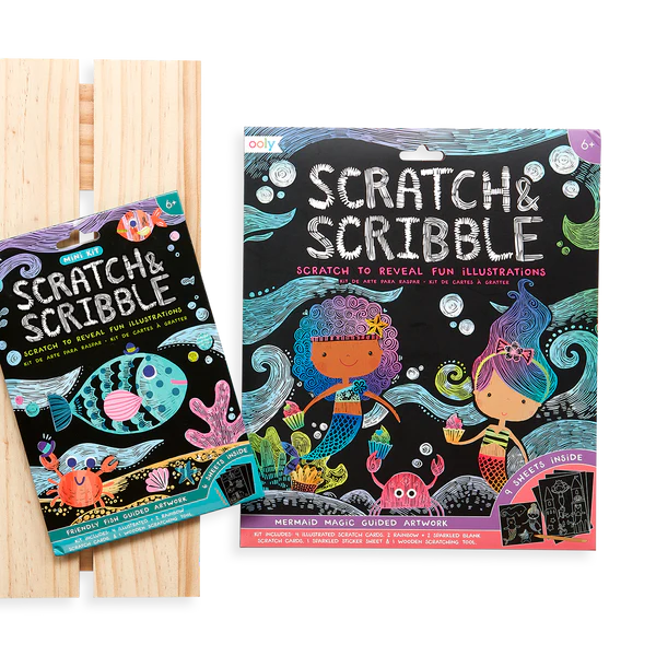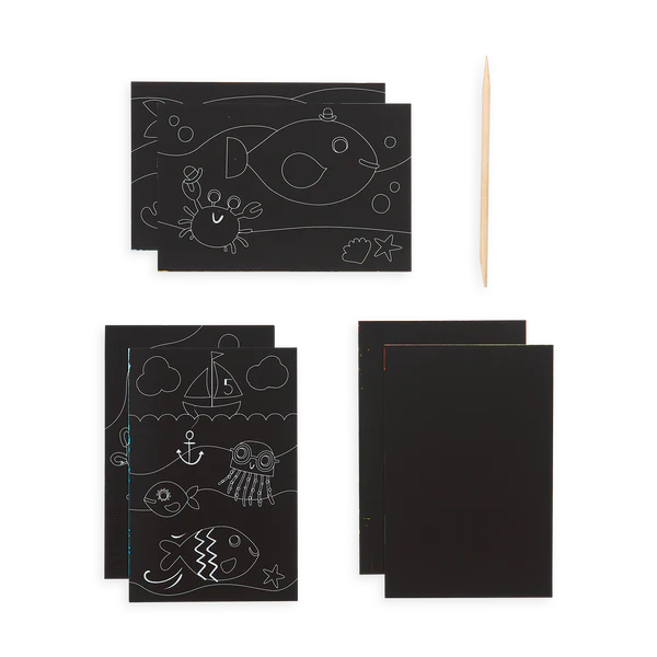 Get busy scratching because the adventure has started! These fun friendly animal themed scratch art cards are filled with easy-to-follow guidelines to reveal the ocean inspired rainbow artwork. Sized for on-the-go fun at 4 x 6 inches these mini scratch art kits for kids are great for travel. Each kit not only has 4 cute animal illustrated cards, but 2 blank cards for creating your own designs, all revealing a rainbow of color using the included wooden stylus.
