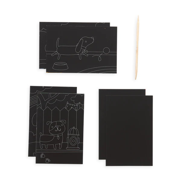 Scratch and scribble to find friendly animals hidden on scratch cards to show their rainbow hues. These pals are easily revealed following the included guidelines of the 4 illustrated cards with the included wooden stylus. Create your own scratch art with 2 DIY blank cards. Everything you need is included in this travel-sized scratch art kit.