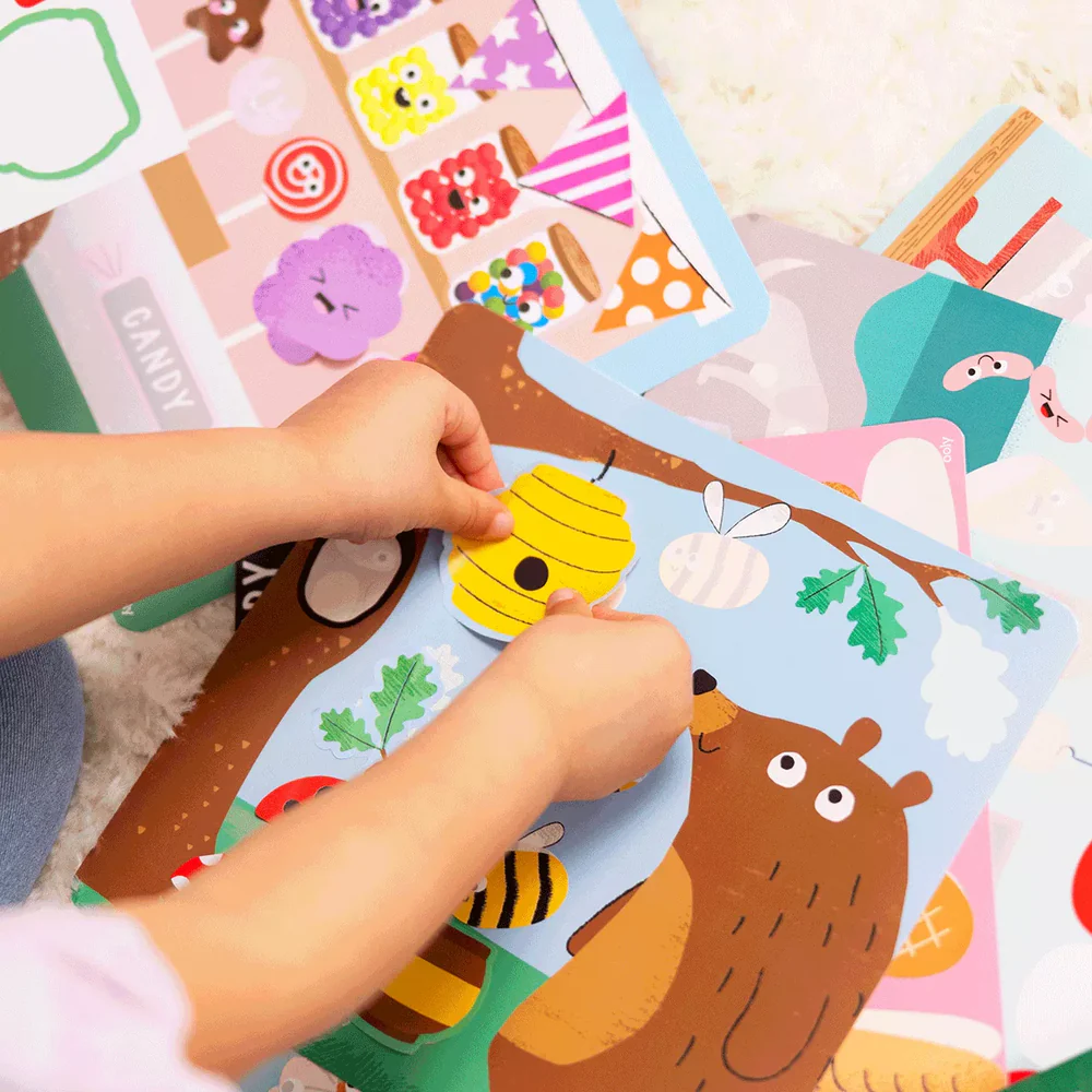 - Scenes include ghosted areas to indicate where stickers should go