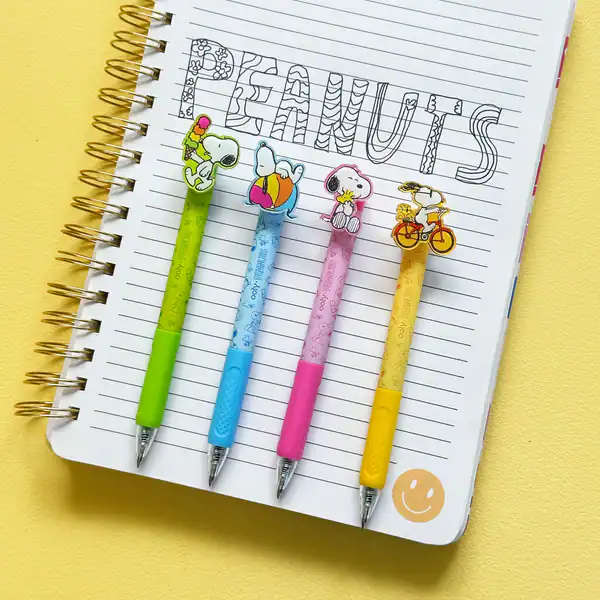 Bring some Peanuts joy to your writing with the OOLY x Peanuts Black Ink Retractable Gel Pens Set! Each of these four retractable pens features a different playful Snoopy scene—Snoopy eating ice cream, hugging Woodstock, riding a bike, and lounging on a beach ball. With colorful barrels in pink, yellow, green, and blue, these black ink pens with gel ink add a fun pop to your school supplies. Jot down notes or sketch Snoopy’s next adventure—these pens make every writing task more enjoyable.