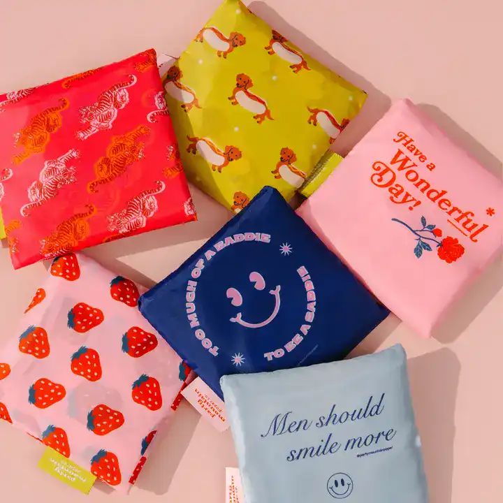 An assortment of cute foldable nylon tote bags with various sayings.