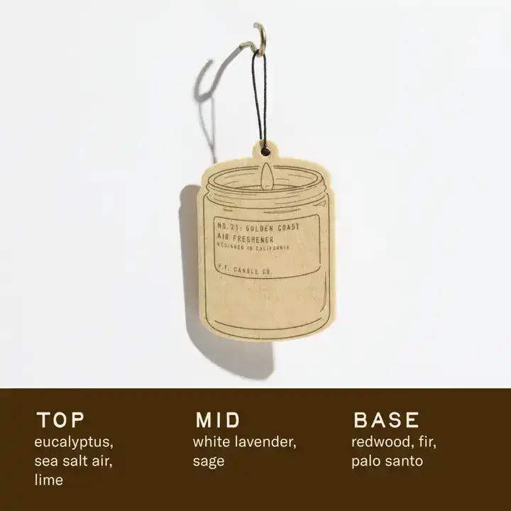 Introducing Air Fresheners: a flame-free collection designed to scent small spaces, like closets, bathrooms, gym lockers, trash cans, hotel rooms, and anywhere else that needs a little fragrance boost. Air Fresheners are pre-packed in pairs, featuring an iconic P.F. Candle-shape and signature kraft paper look.
