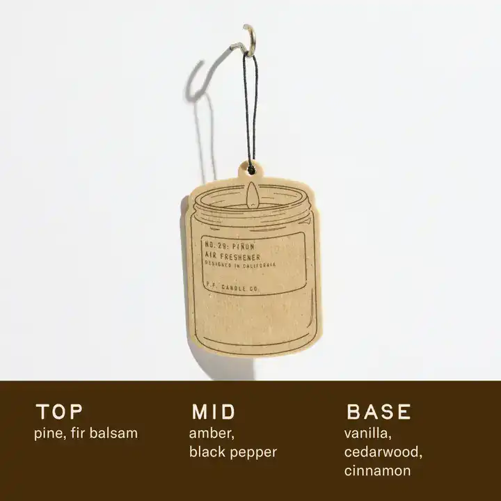 Introducing Air Fresheners: a flame-free collection designed to scent small spaces, like closets, bathrooms, gym lockers, trash cans, hotel rooms, and anywhere else that needs a little fragrance boost. Air Fresheners are pre-packed in pairs, featuring an iconic P.F. Candle-shape and signature kraft paper look.