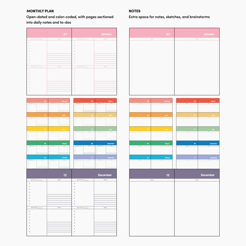 It’s open-dated, so you can start planning whenever you’re ready. There are 12 colour-coded sections—one for each month!