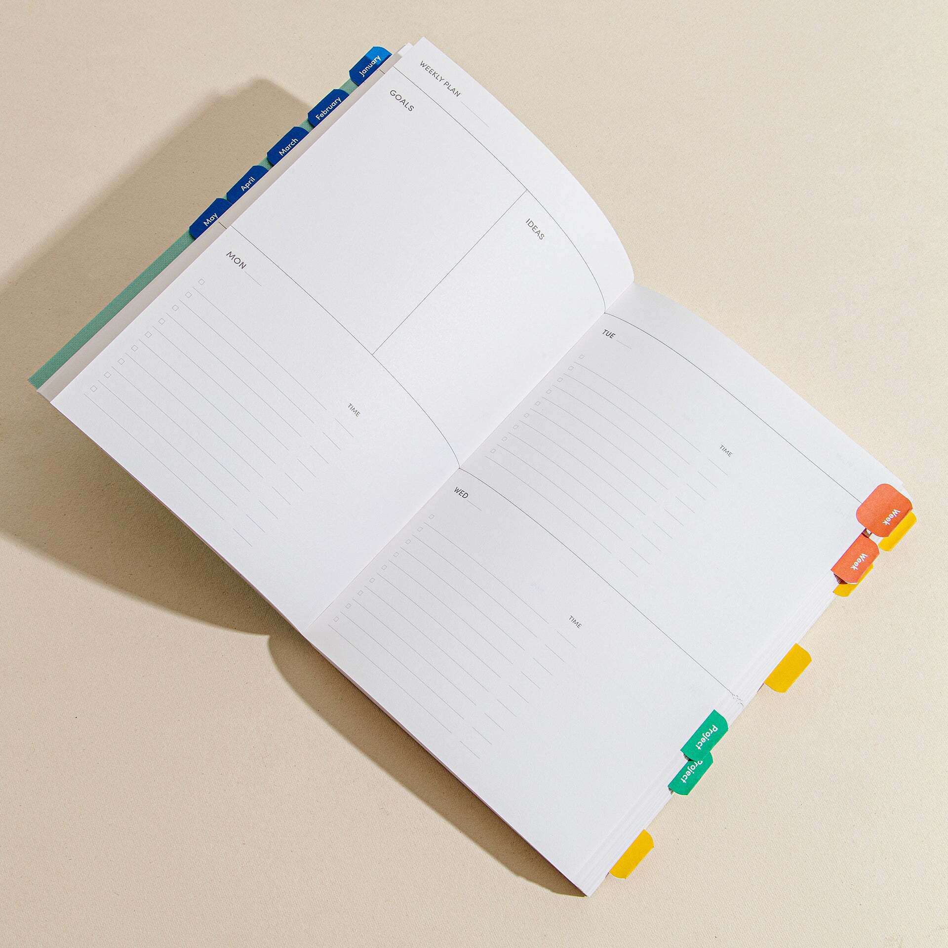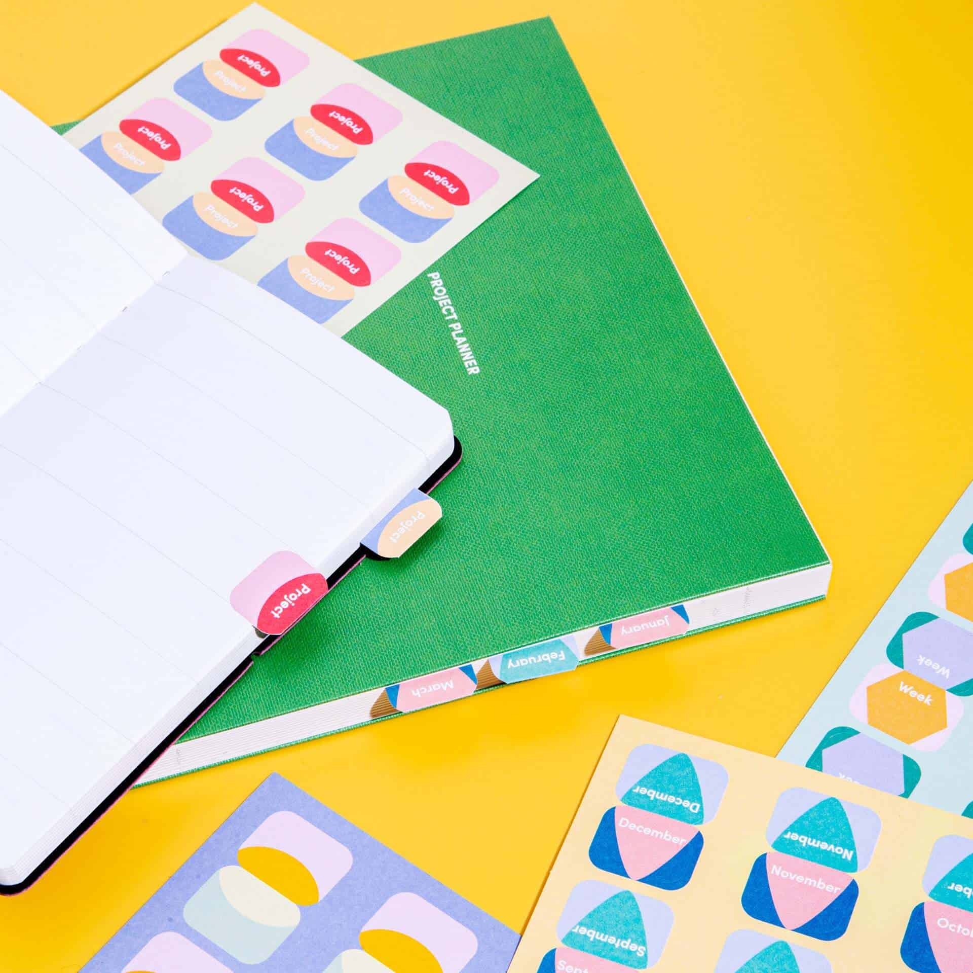 Includes four sheets of sticker tabs (months, week, project, and blank)