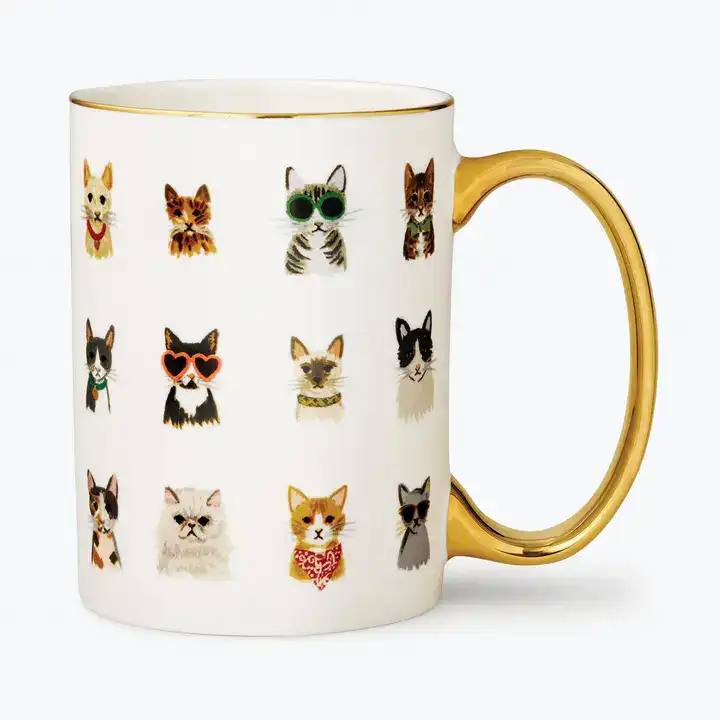 Feline friends rocking their favorite accessories. Celebrate your favorite cat every morning with our Cool Cats mug. Our porcelain mugs feature illustrated designs and a gilded rim and handle to add a little something special to your favorite beverage.
