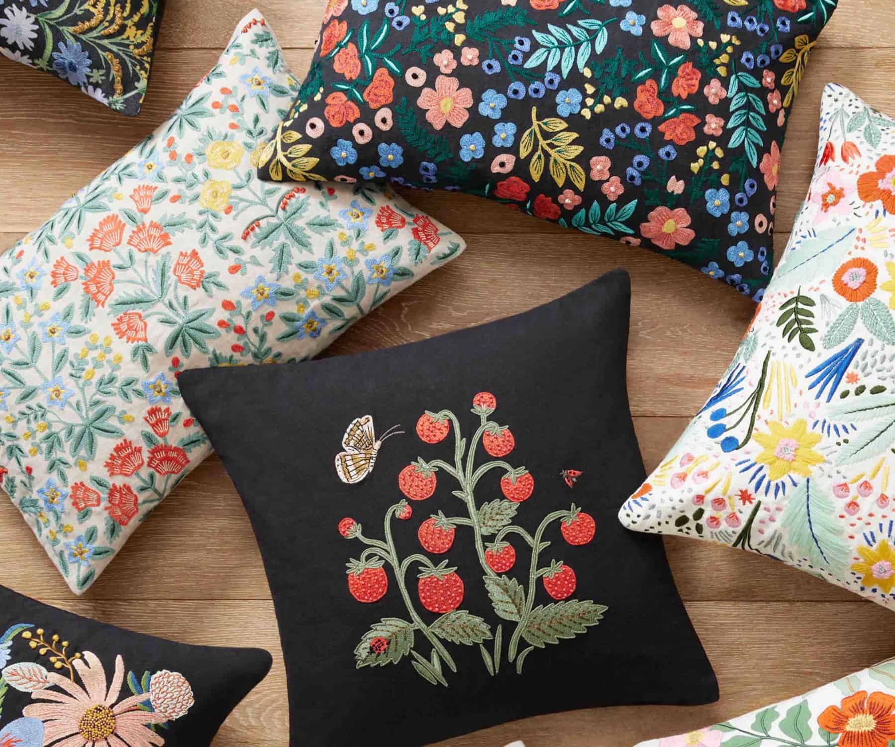 The floral motif of the Mughal Rose embroidered pillow was inspired by traditional textile designs and reimagined with Rifle Paper Co. florals.
