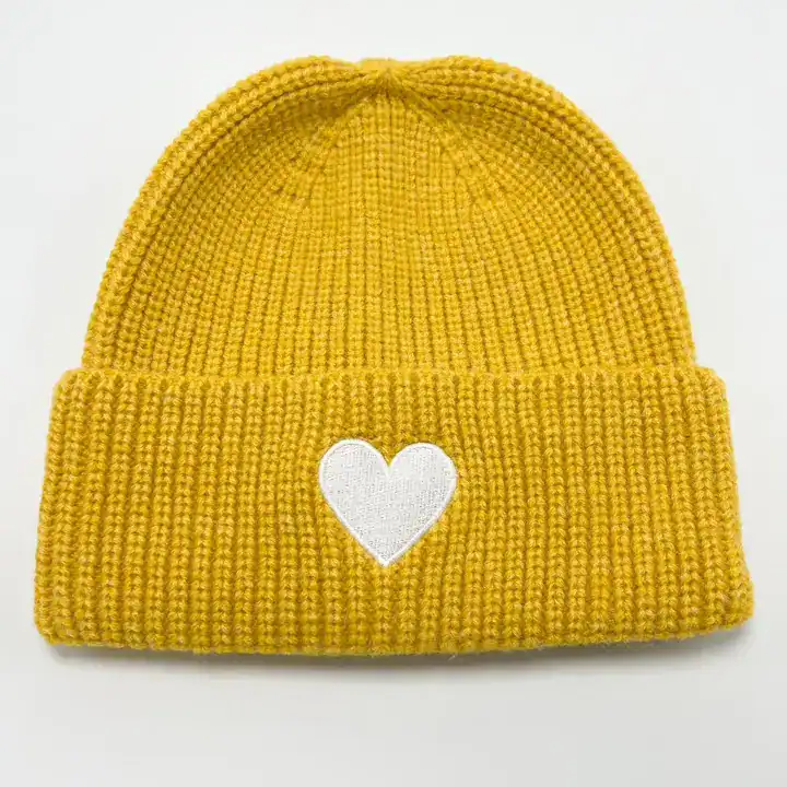 This beanie, in a vibrant mustard hue, is adorned with a contrasting white heart symbol, a signature of our brand.