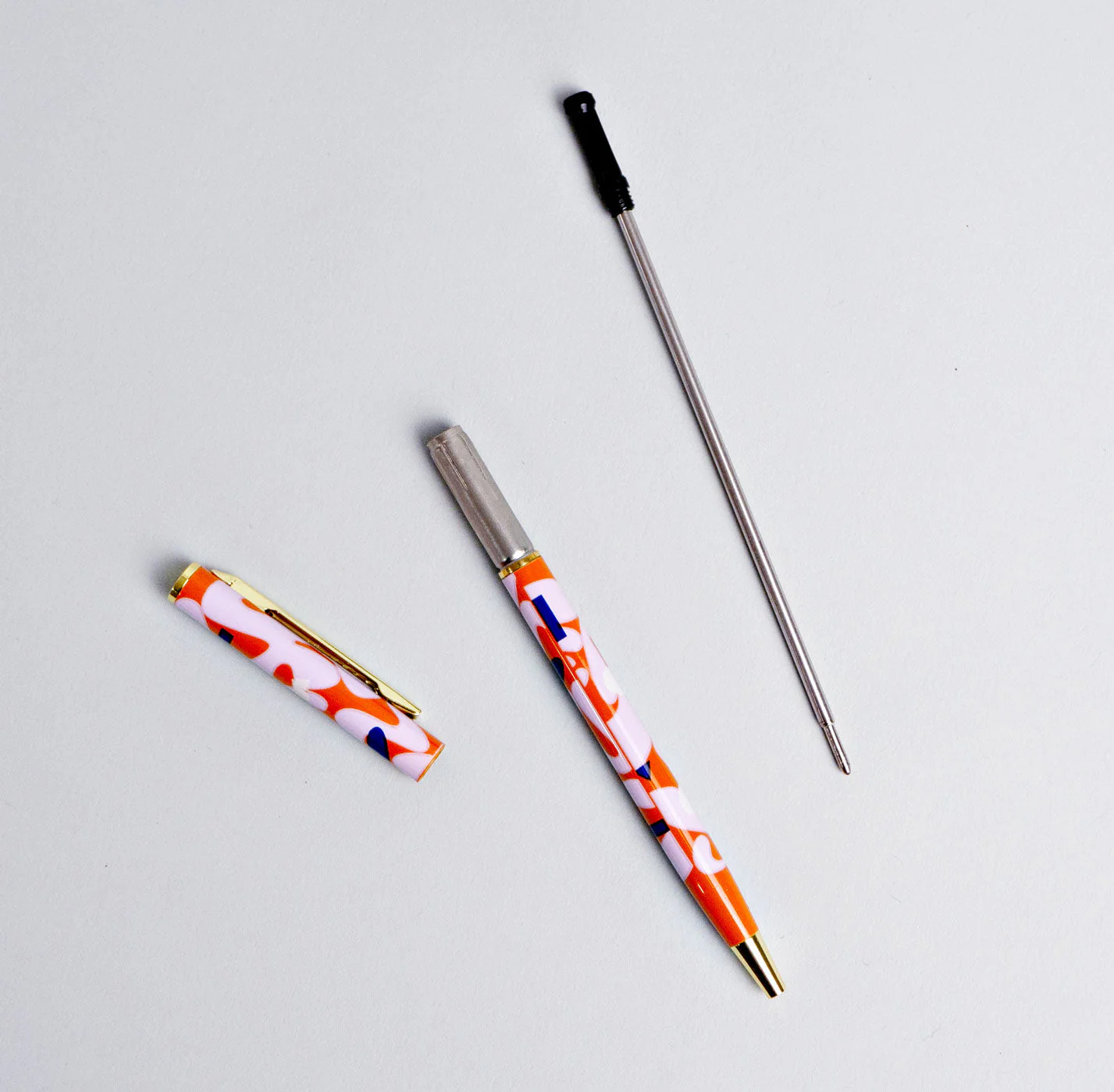 Metal body and refillable – refills sold separately. To change the ink cartridge, simply pull the pen apart in the middle, unscrew the black refill out of the pen and insert the new one.