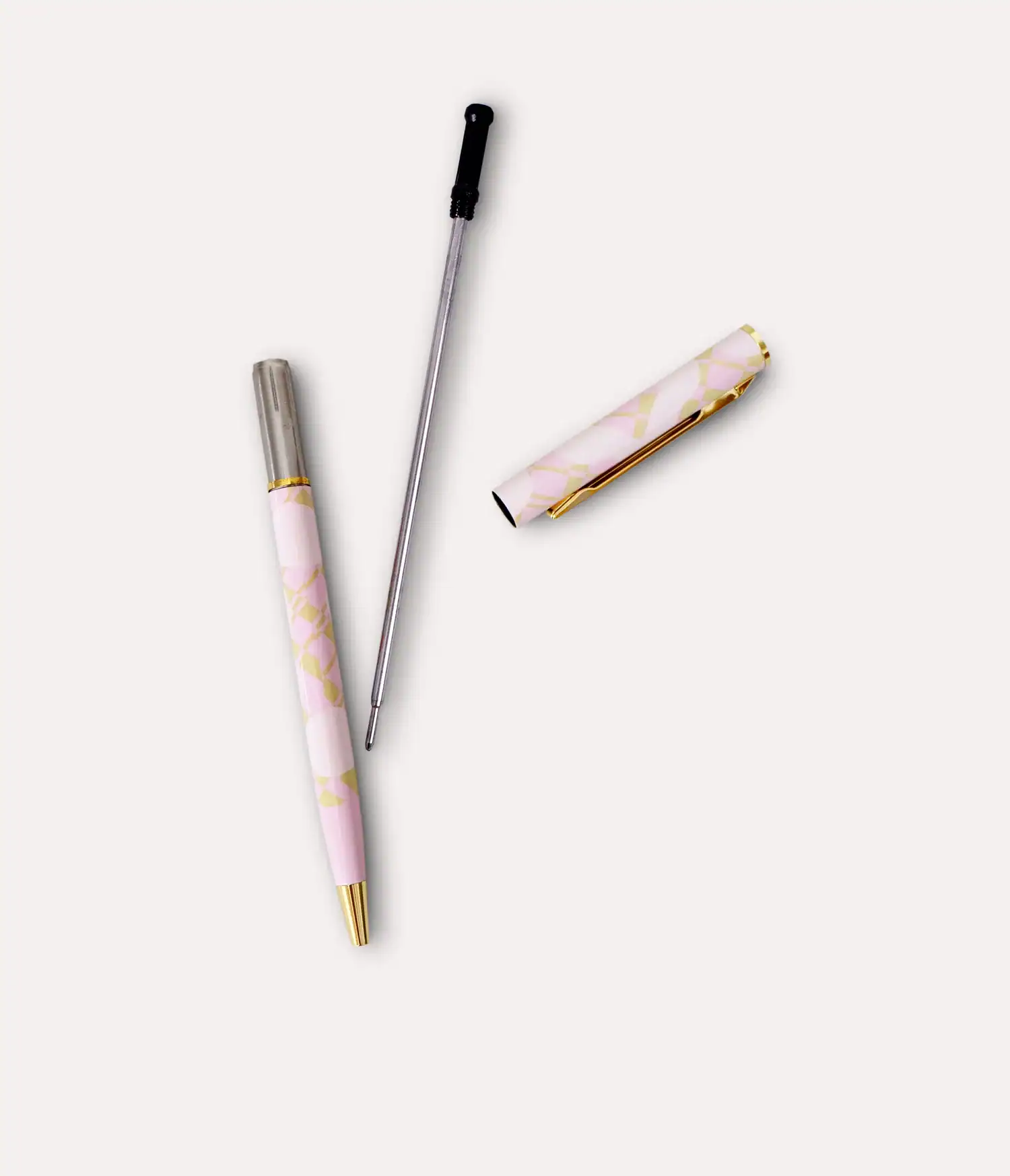 - Slimline metal body with pink + cream tile print